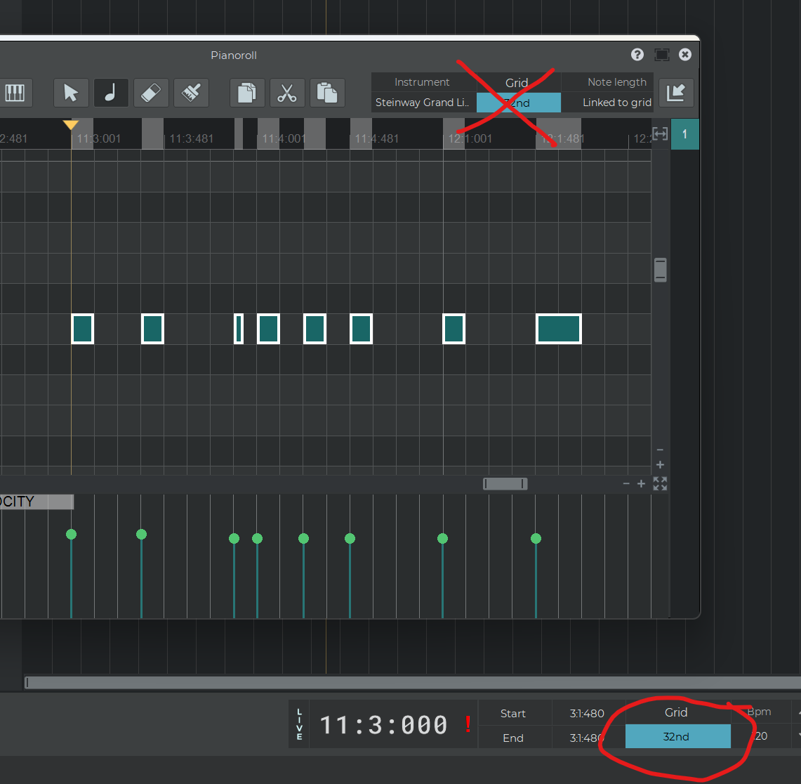 Note that it doesn’t follow the grid set in the pianoroll. See the screenshot below with the button for the correct grid subdivision to set.