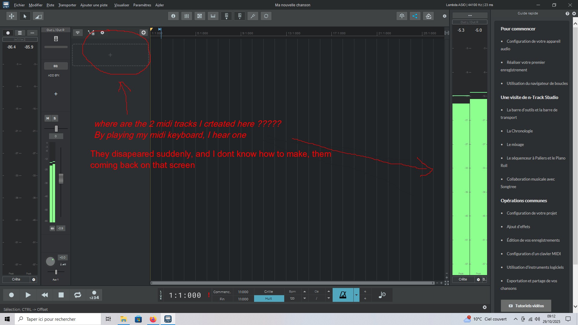 However, when I play on my keyboard, I can hear the VST instrument playing, and you can see the VU meters moving in the screenshot, but I don’t know where the sound is coming from since the tracks have disappeared. I even closed and reopened nTrack, and the situation is the same.